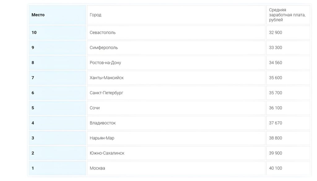 Размер заработной платы напрямую зависит от города. Вот официальные цифры по российским городам (сразу скажем, что это зарплата «чистыми», то есть без учета премий, чаевых и прочих дополнительных вариантов получения дохода):
