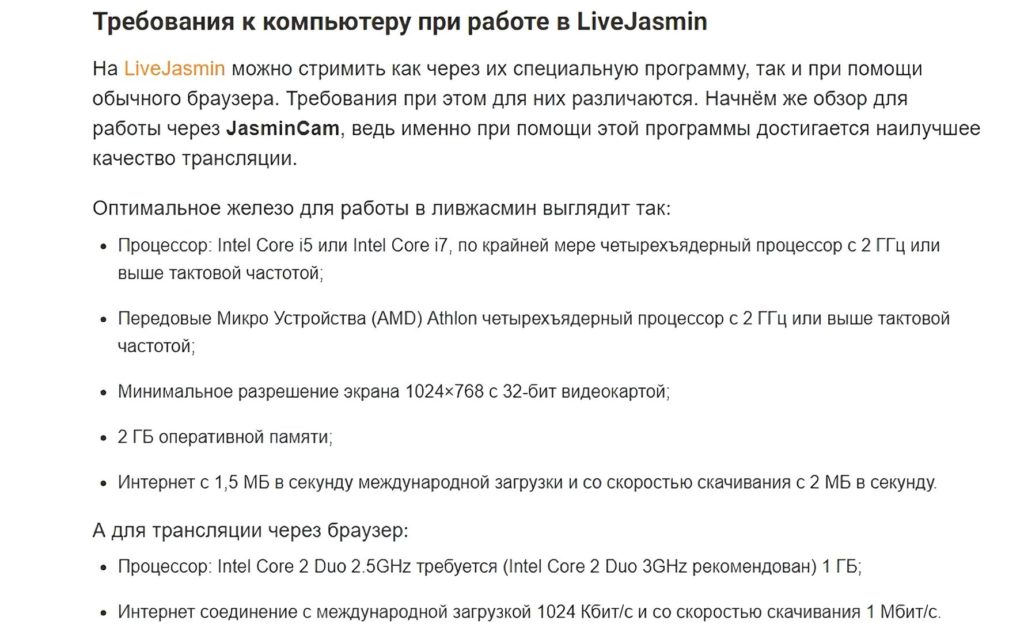 Оборудование для вебкам бизнеса – это и персональный компьютер (ноутбук). Тут все просто – чем лучше «железо», тем меньше проблем будет с трансляциями. Например, вы исключите зависание картинки. Вообще требования к ПК указываются на платформах. Вот у LiveJasmin следующие требования: