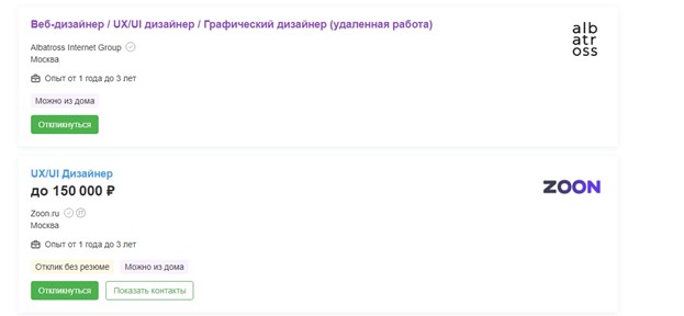 Прелесть профессии даже не в том, что дизайнер зарабатывает много, и у него интересная и креативная работа. Он может трудиться удаленно! Взглянем на доску объявлений HH.ru и увидим, что, работая дома, специалист по проектированию дизайнов интерфейсов веб-ресурсов может получать от 150 тысяч рублей ежемесячно: