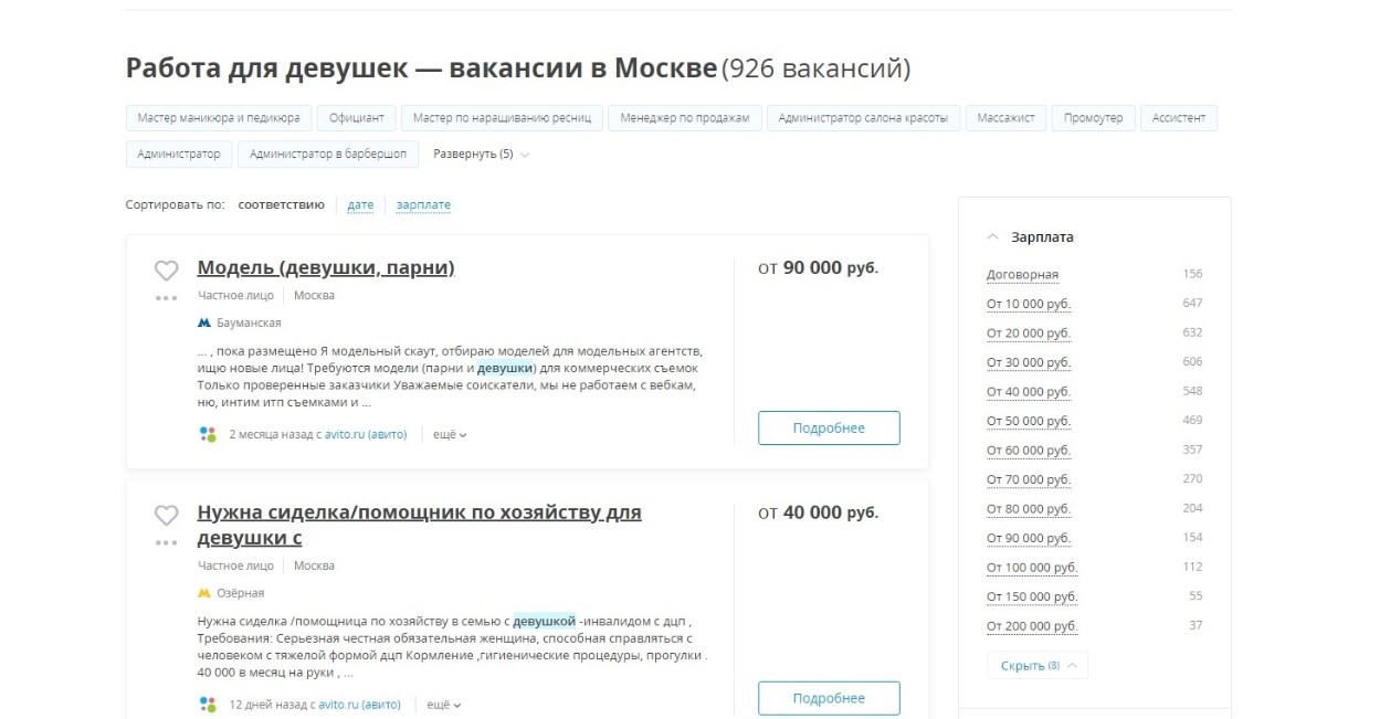 Мы прекрасно видим, что в столице прямо сейчас девушка легко может найти работу с зарплатой от 50 до 100 тысяч рублей. Вакансий предостаточно, в том числе где не требуют опыта или образования. Но можно для наглядности провести сравнение по популярной работе «менеджер». В Краснодаре большинство работодателей предлагают заработную плату в диапазоне от 40 до 80 тысяч рублей. А вот московские компании платят и 100, и 200, и