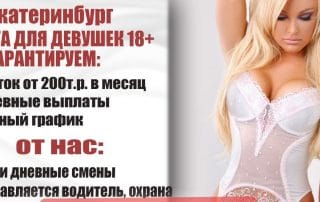 Требуются девушки на высокооплачиваемую работу в г. Екатеринбурге. Гарантируем: Заработок от 200 т.р в месяц ежедневные выплаты свободный график От нас: Ночные и дневные смены Предоставляется водитель, охрана. Зарплата: от 200 000 в месяц