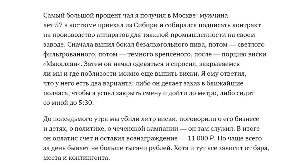 Что касается чаевых, то здесь все зависит от того, как и где барышня работает. Вот отличная статья, где опытный бармен делится информацией о том, как формируется заработок, включая чаевые. В солидном заведении за смену легко можно заработать до 4 тысяч рублей. Но есть и примеры, когда бармены зарабатывали «чаем» до 10 тысяч рублей. Вот признание одного из специалистов, который работал в популярном столичном заведении.