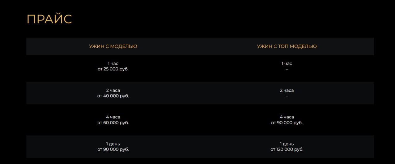 Для наглядности приведем прайс в престижном московском агентстве IMG MODELS. Сразу стоит оговориться, что здесь работают только элитные эскортницы. Их заработок точно превышает 1 миллион рублей месяц. Впрочем, вы сами можете в этом убедиться, взглянув на расценки во вкладке услуг «эскорт»: